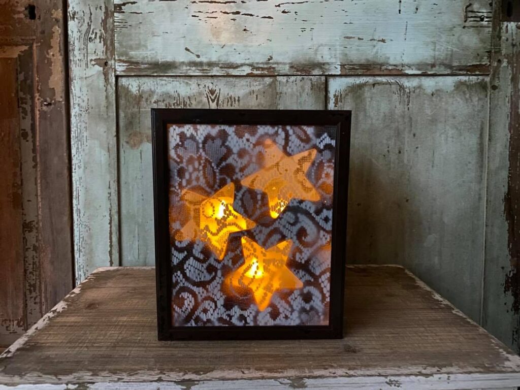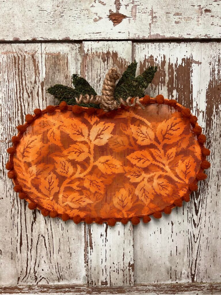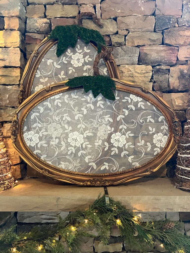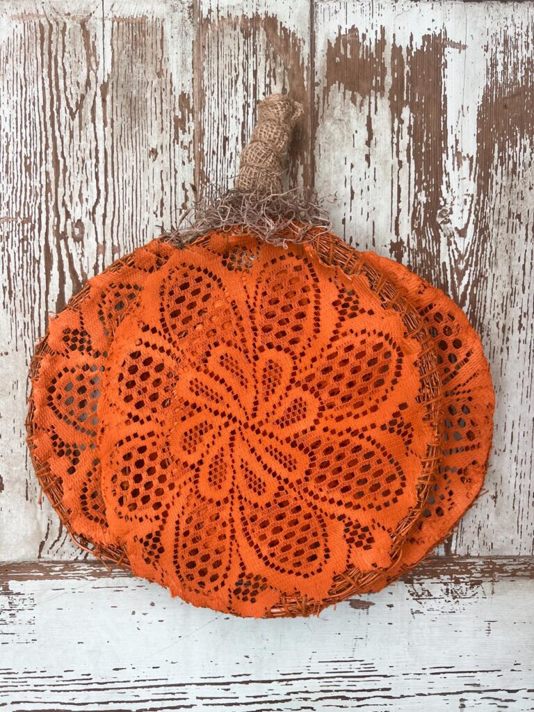 In this charming fall DIY, lace adds a delicate, vintage touch to an old frame turned pumpkin décor piece. By layering soft lace fabric over the structure and letting it peek through the design, the project gets a sweet, textured look that pairs beautifully with autumn colors and rustic accents. It’s a lovely example of how lace can bring softness and cozy charm to seasonal décor.