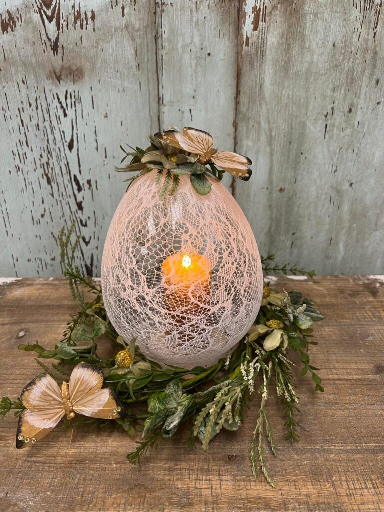 In this charming light-up egg lantern project, lace plays a key role in creating that soft, glowing texture. The delicate lace is wrapped and layered around the egg frame so when the lights are added, it casts beautiful, cozy patterns that feel vintage-inspired and ethereal. It’s a perfect example of how a touch of lace can elevate a DIY from simple to stunningly decorative.