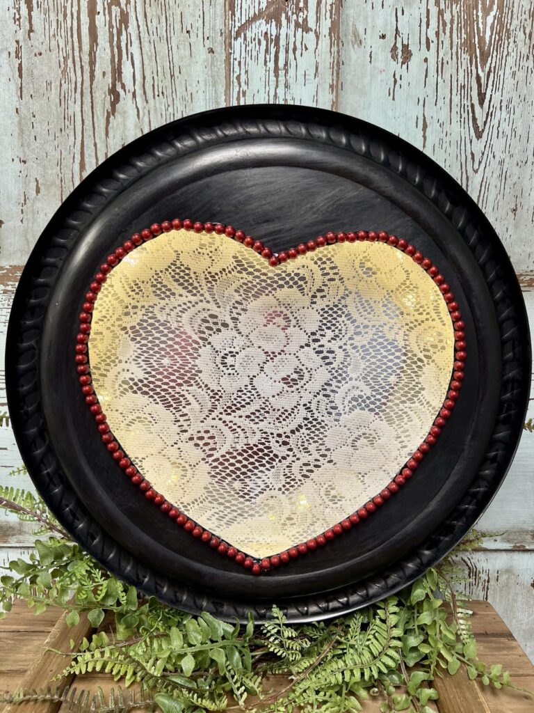 In this adorable light-up heart project made from Dollar Tree trays, lace adds that soft, romantic texture that takes the design to the next level. Wrapping or layering delicate lace around the heart frame lets the lights glow through with a beautiful, vintage-inspired pattern — making this piece perfect for Valentine’s Day or cozy everyday décor. It’s a lovely example of how a touch of lace can turn simple trays and lights into something elegant and charming.