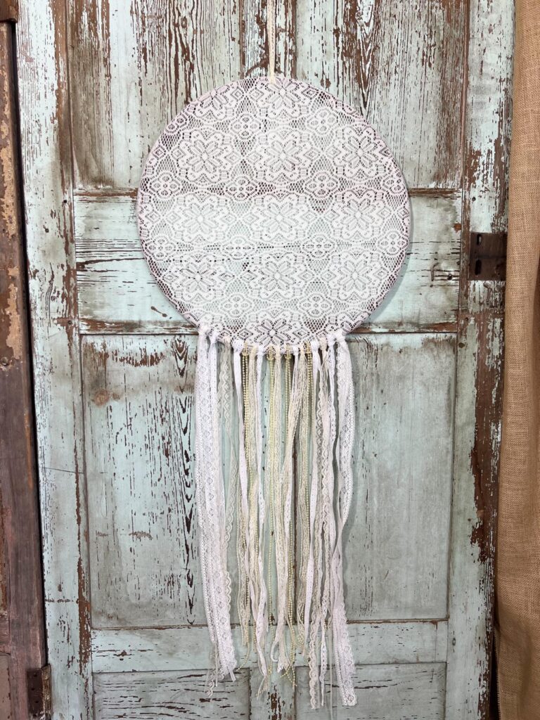 In this Dollar Tree fun hoop dream catcher project, lace is what brings the dreamy texture and romantic charm to the design. The delicate lace strips are woven and draped through the hoop to create soft movement and eye-catching detail that feels whimsical and vintage-inspired. It’s a lovely example of how lace can turn basic supplies into a beautiful, cozy décor piece that’s perfect for bedrooms or boho-style spaces.