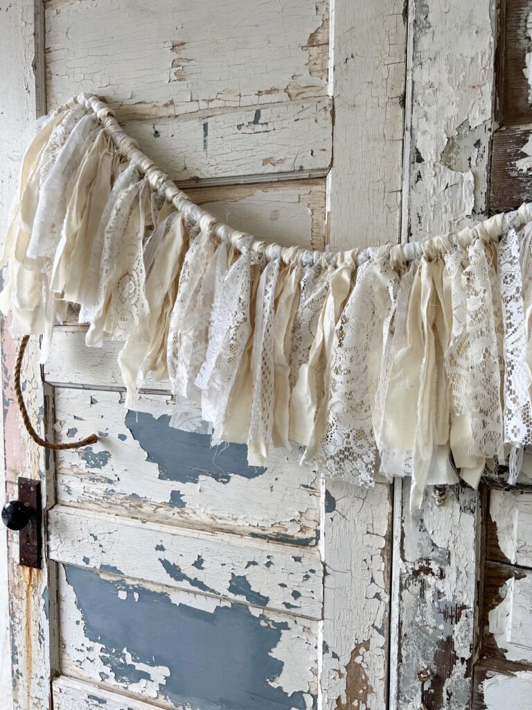In this fabric rag garland tutorial, lace adds lovely texture and vintage charm among the strips of fabric. Tying delicate lace strands in with the cotton and printed fabric gives the garland a soft, shabby-chic feel that makes it perfect for seasonal décor or everyday style. It’s a great example of how adding lace to simple fabric strips can elevate an easy DIY into something extra pretty and unique.