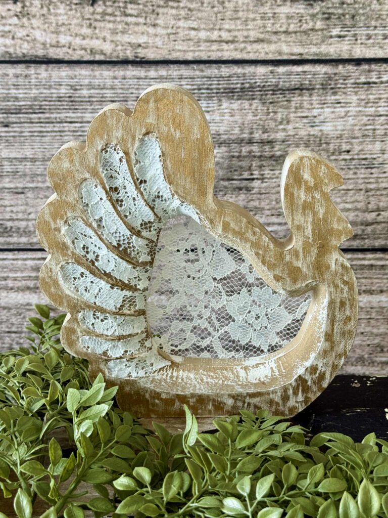In this wooden turkey makeover from a pop shelf base, lace is the delicate detail that adds texture and charm to the rustic shape. By layering pretty lace trim and fabric onto the turkey’s body, the project brings a soft, vintage-inspired flair that balances perfectly with the wood’s natural tones. It’s a fun reminder that just a touch of lace can elevate a whimsical seasonal décor piece into something uniquely cozy and charming.