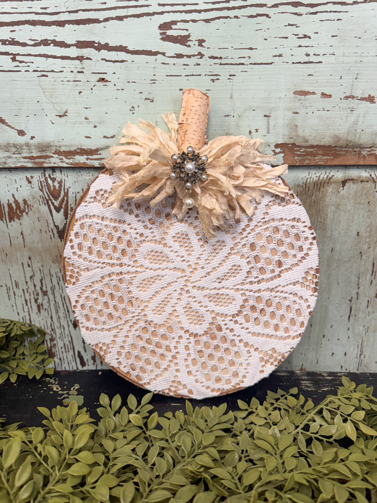 In this easy Dollar Tree pumpkin DIY, a simple lace doily is what gives the wood disc pumpkin its beautiful texture and vintage charm. Layering the delicate doily over the wooden base instantly softens the look and adds that cozy, farmhouse feel we all love for fall. It’s such a simple way to use lace to transform basic craft supplies into a sweet seasonal décor piece.