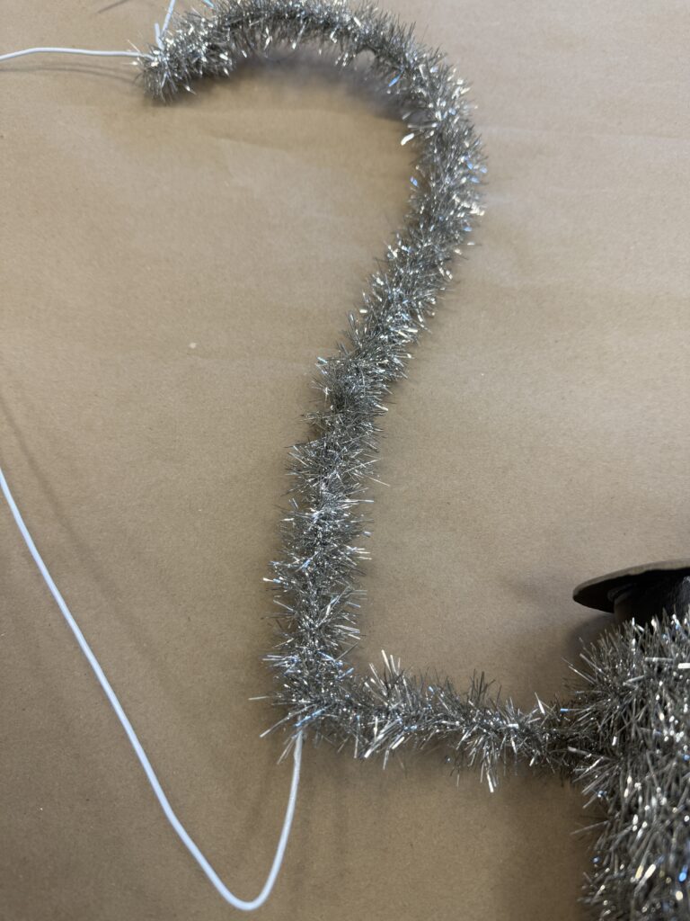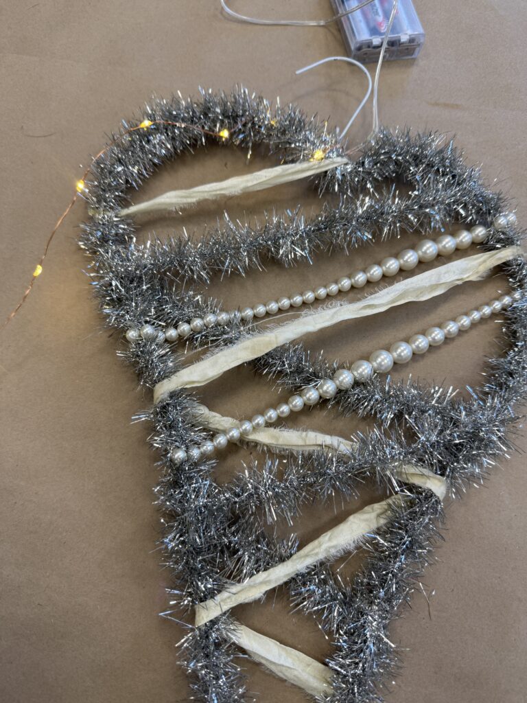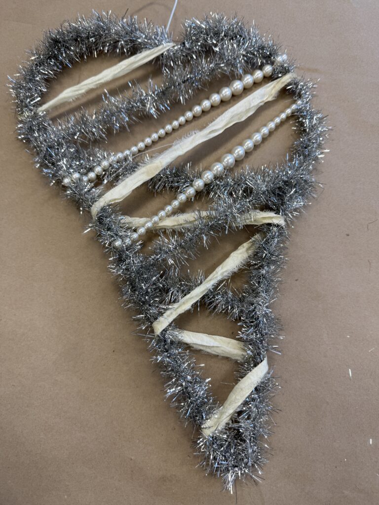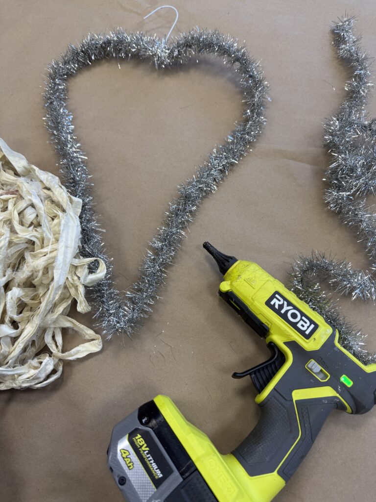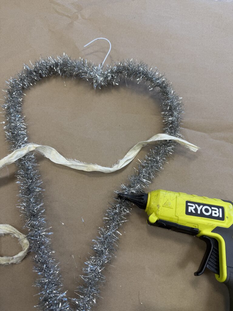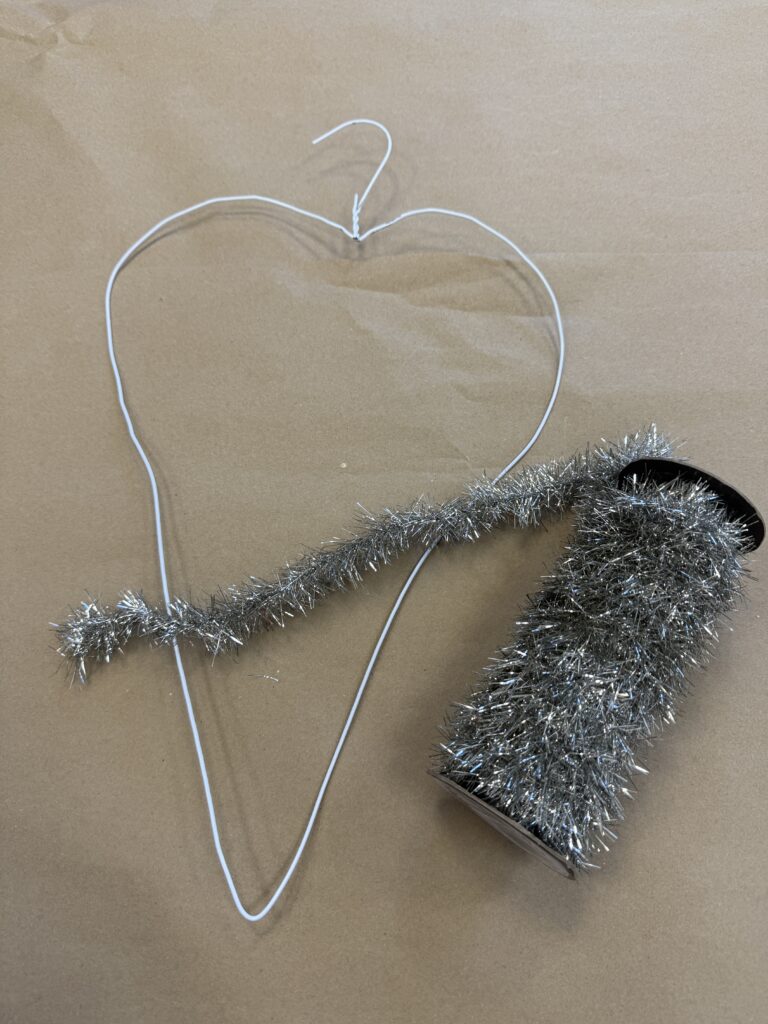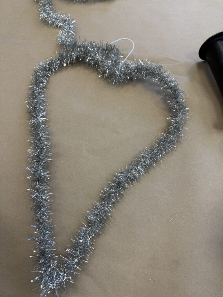 Next, I wrapped the wire hanger with the silver tinsel from our website. This step really helps bring the heart to life and adds that fun sparkle we all love. You can find the exact tinsel I used here: https://theshabbytreeboutique.com/shop-mBiWY/p/9-vintage-silver-tinsel?searchid=687538&search_query=silver+tinsel