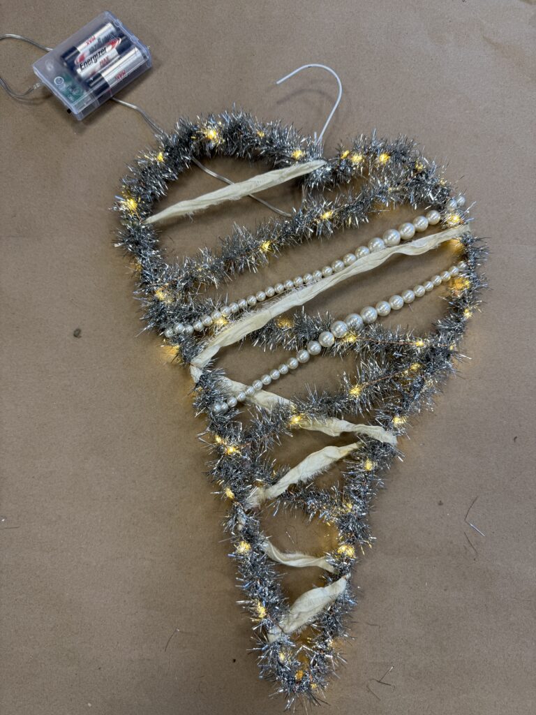 I wrapped everything all the way around the heart, and since this piece will be hanging, I’ll simply tuck the battery pack under the garland so it stays hidden.
