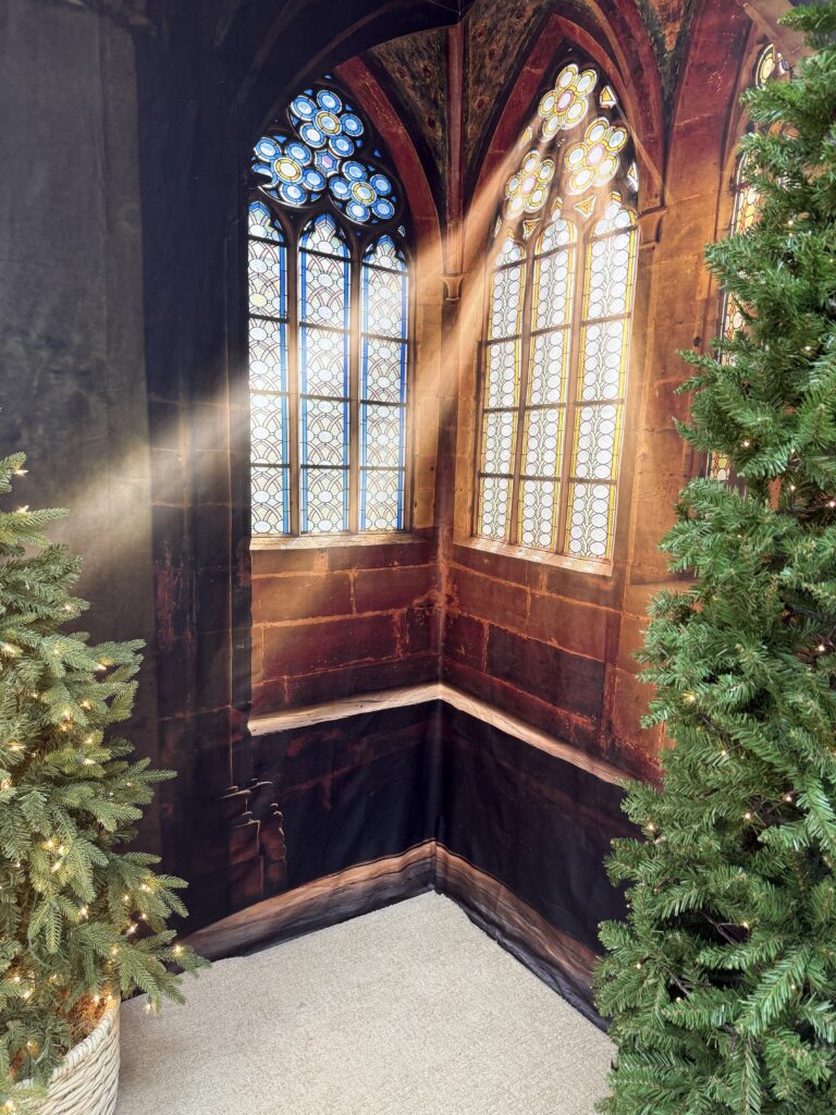 This unique backdrop brings a beautiful, old-world feel to photos and lives! The stained glass windows and stone walls add character and richness!