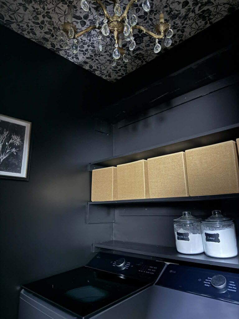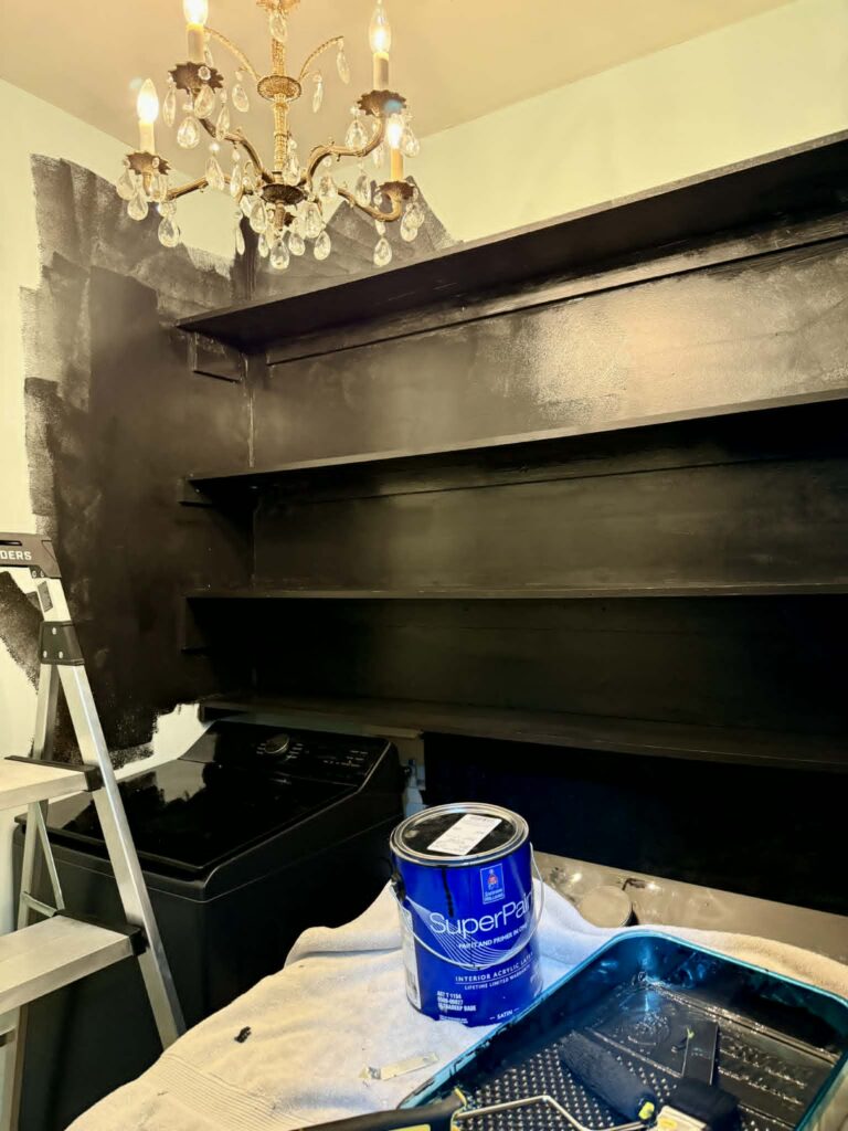 I’ve been wanting to give my laundry room a quick and easy makeover, and I knew paint and wallpaper were the answer. I love dark colors in my home, which is why I decided to paint my laundry room black.