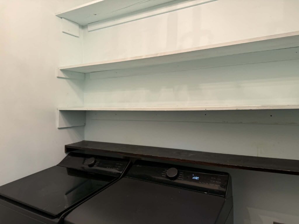 My laundry room is very small, with wooden shelves above the washer and dryer.