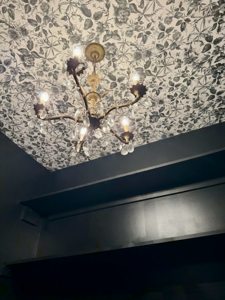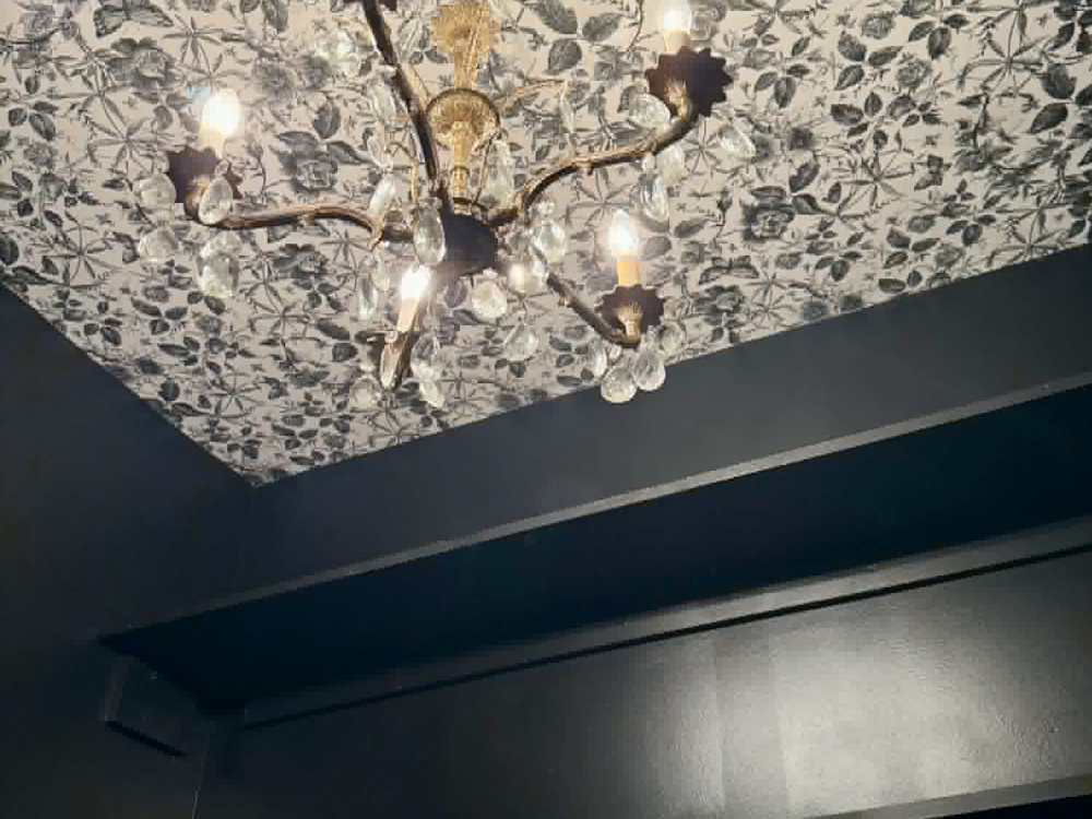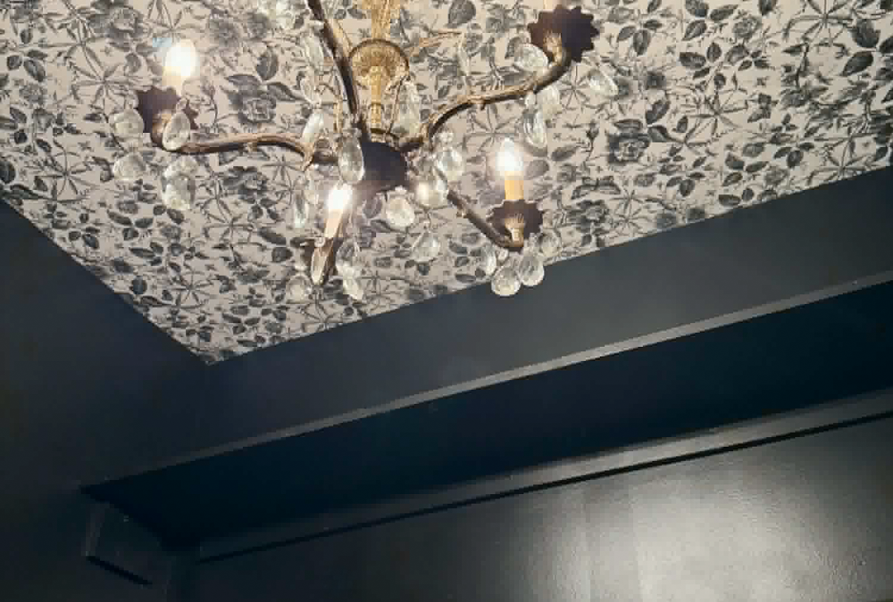 Once I had the entire room painted, I then started adding the wallpaper to the ceiling. I highly recommend hiring someone for this step—it can be very difficult, and mine is not perfectly lined up.