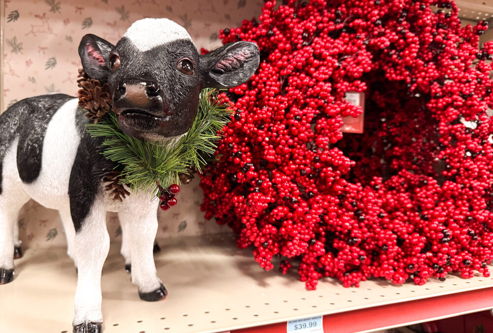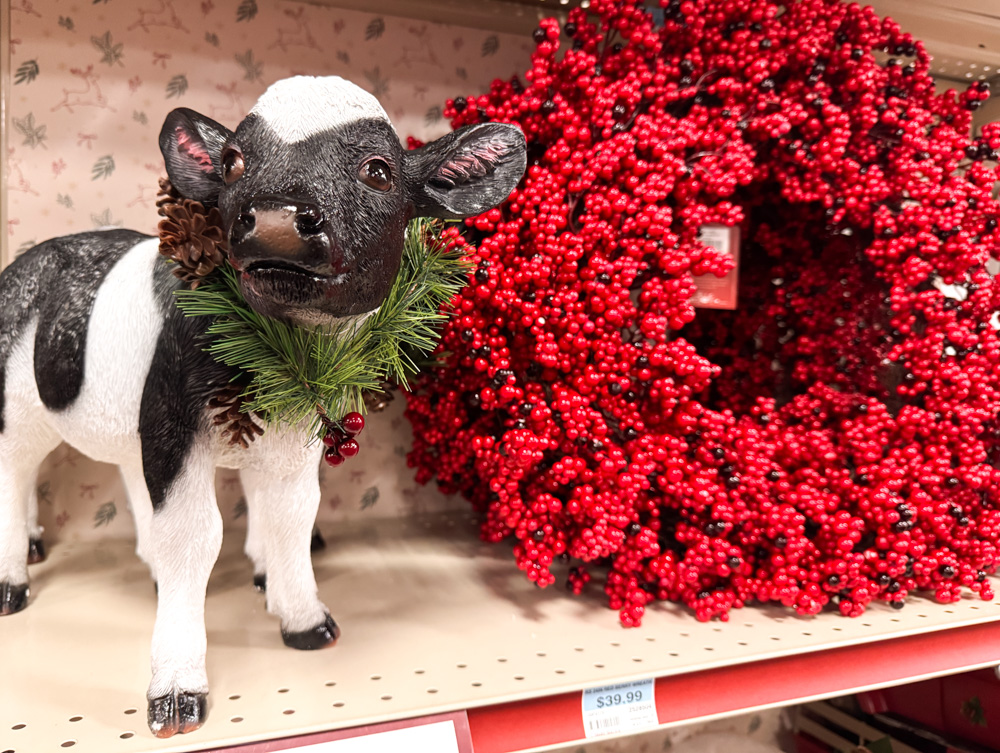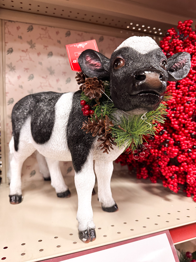 This small cow figurine is all dressed up for the holidays with a pine and berry wreath around its neck. It’s a sweet little touch of farmhouse Christmas charm.