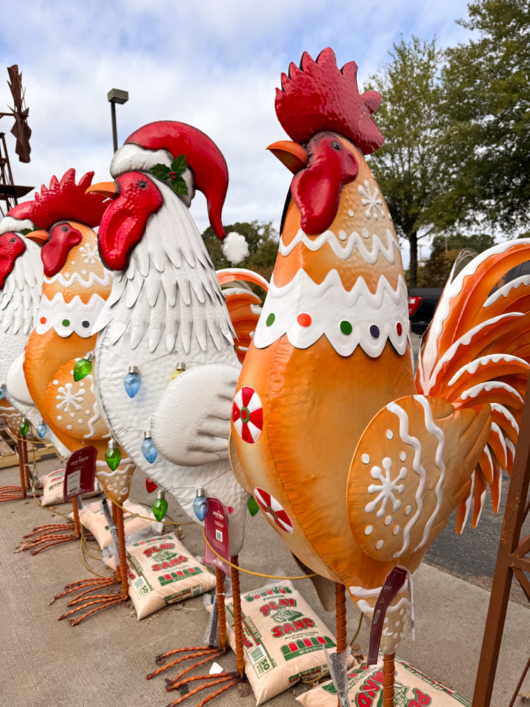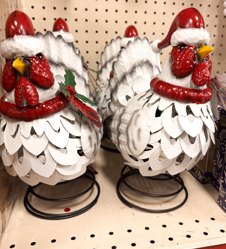 These white metal chickens with Santa hats and spring bases are so whimsical! They’d look great on a porch, shelf, or tucked into a festive display.