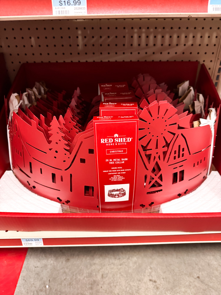 This bright red metal tree collar has little barn and windmill cutouts all the way around. It’s the perfect finishing touch for a farmhouse-style Christmas tree.