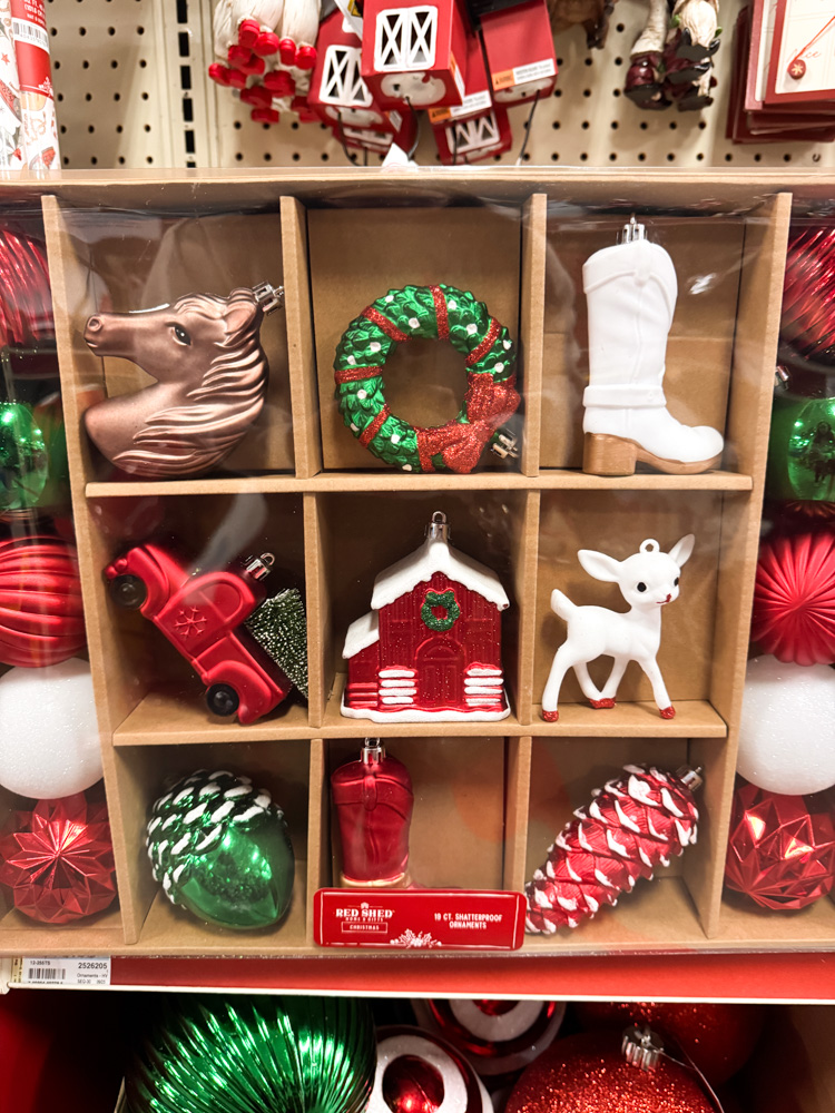 This boxed ornament collection has the cutest mix of Christmas icons — a little red barn, cowboy boot, wreath, deer, and even a vintage truck. It’s the perfect blend of country charm and holiday sparkle.