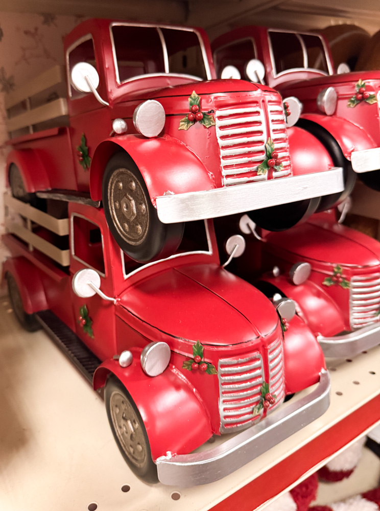 The classic red truck never goes out of style, and this one’s decked out with holly details. It would look adorable filled with bottle brush trees or tiny wrapped gifts.