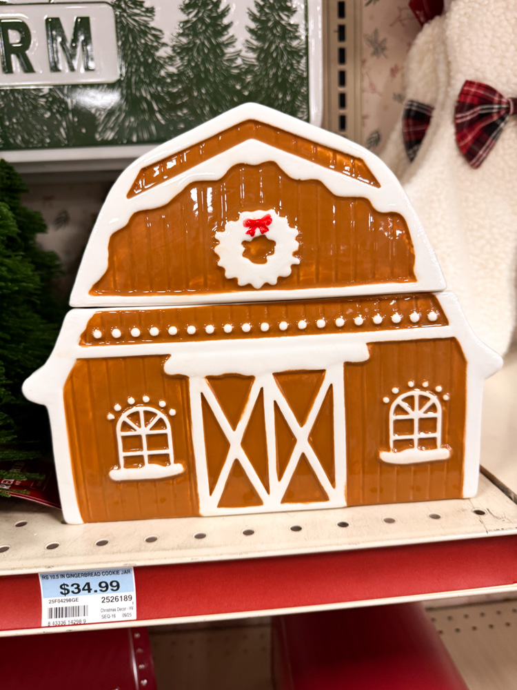 A gingerbread-style barn cookie jar? Yes, please! It’s detailed with snowy white trim and a festive wreath — the perfect way to store Christmas treats.