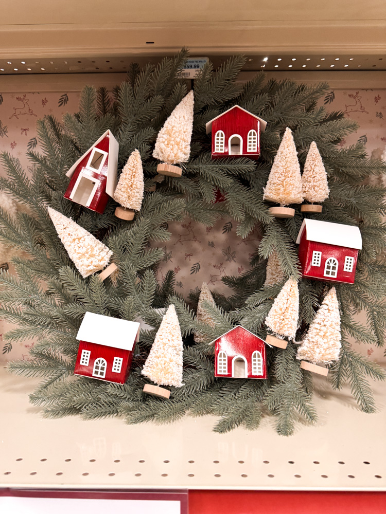 This wreath feels like a little winter village. With tiny red barns, bottle brush trees, and snowy details, it’s full of cozy, country charm.