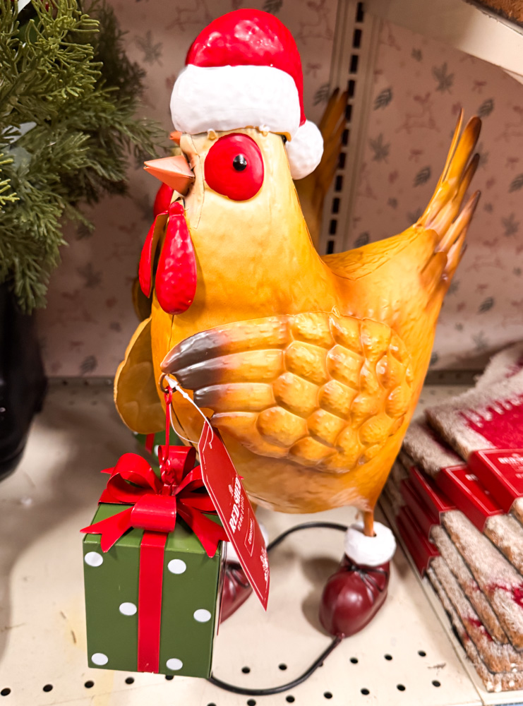 This cheerful chicken is all dressed up in a Santa hat and boots, proudly carrying a wrapped present. It’s such a fun and unexpected holiday accent piece.