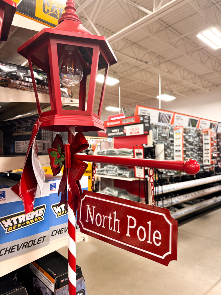 This metal North Pole sign looks straight out of Santa’s workshop. It lights up and adds such a magical touch to any entryway or porch display.