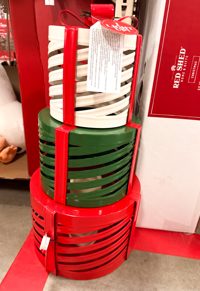These stacked red, green, and white metal gift boxes are adorable and festive. They light up too — a great way to bring height and color to your Christmas display.
