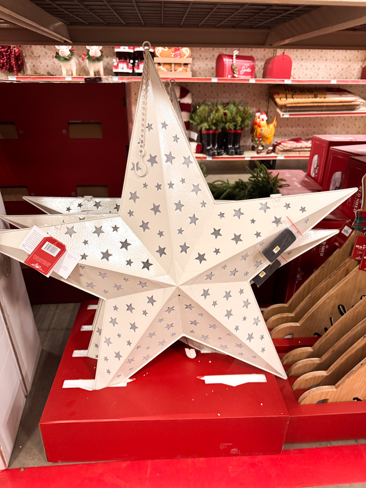 This oversized white star is covered in tiny cutout stars that let light shine through. It’s stunning when lit and makes a perfect statement piece for indoors or out.