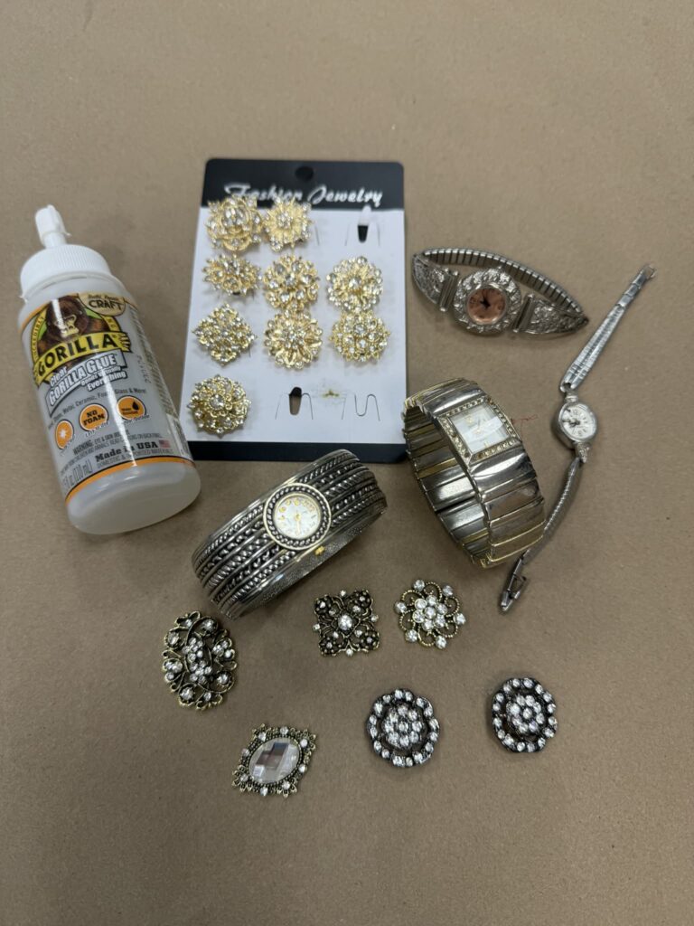I’ll be using Gorilla Glue to securely attach the bling pieces right onto the face of the watch. This strong adhesive works great for DIY jewelry projects and helps ensure your embellishments stay in place.