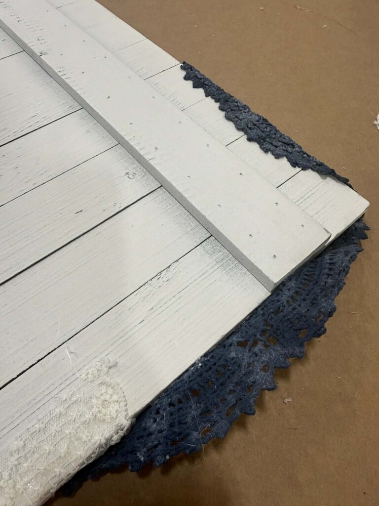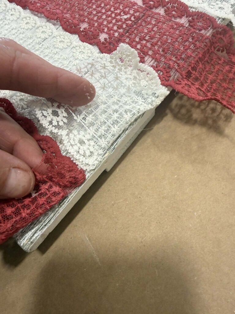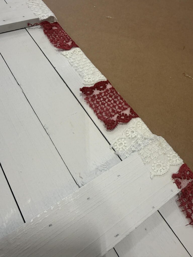 The first step is to cut your lace ribbon into strips to go across your board. My board measures 24” x 18”, but you can use any size board you want for this DIY Americana flag. I cut 7 strips of lace, and each strip was about 26” long.
