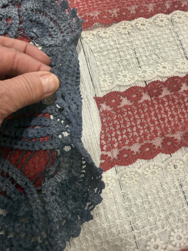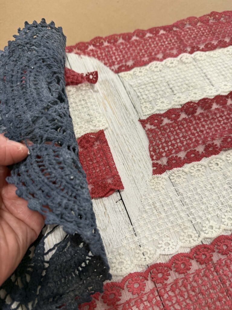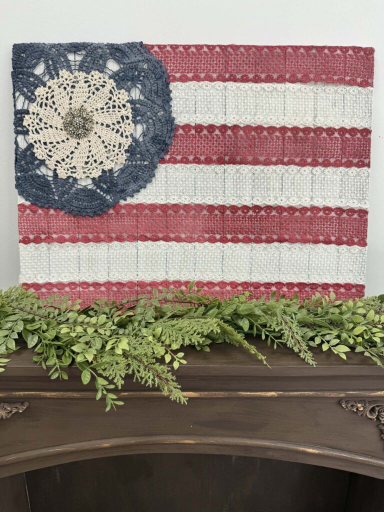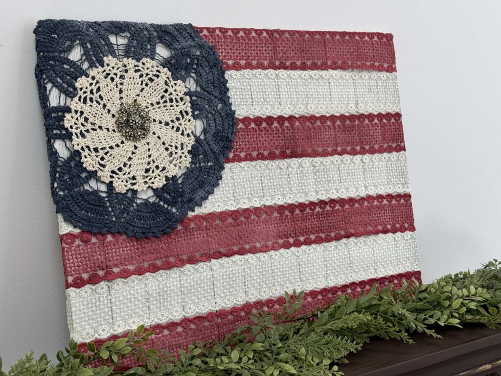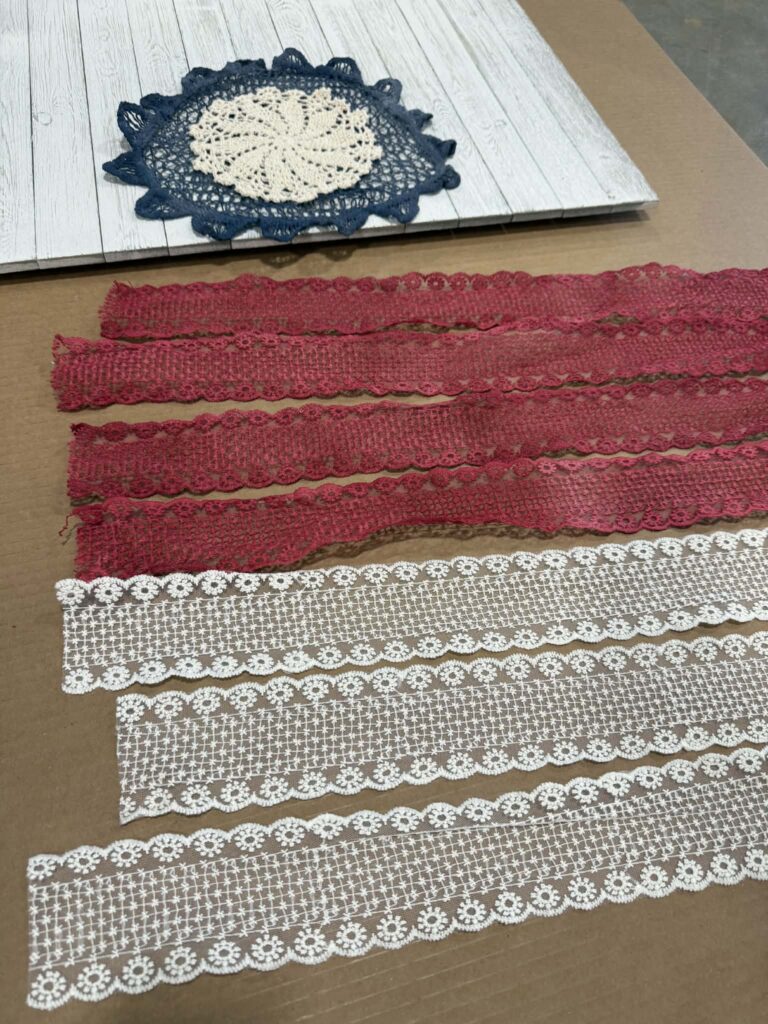 I love creating home decor using lace and doilies. We recently added a beautiful wide lace ribbon to our website, and I’m so excited to get creative with it. There are so many different ways to use lace ribbon in DIY home decor, but I thought it would be fun to create an Americana flag decoration.