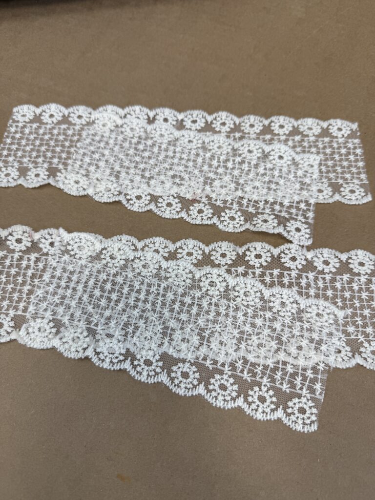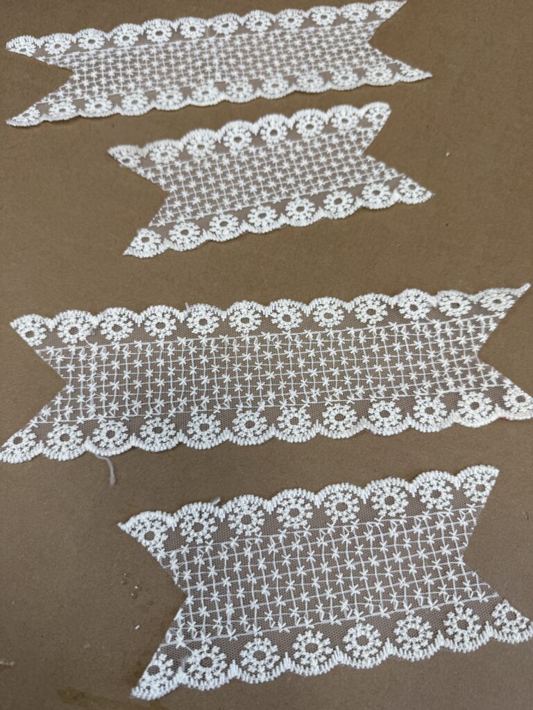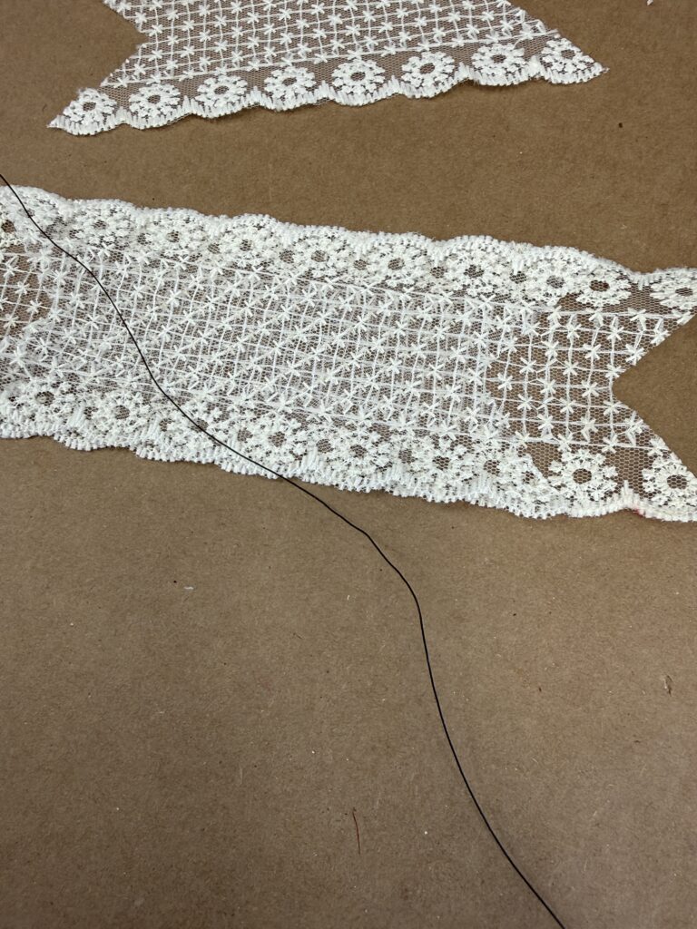 Then I grabbed some of our 2.5″ wide cream lace ribbon and cut it into different lengths and cut a dovetail on each end.