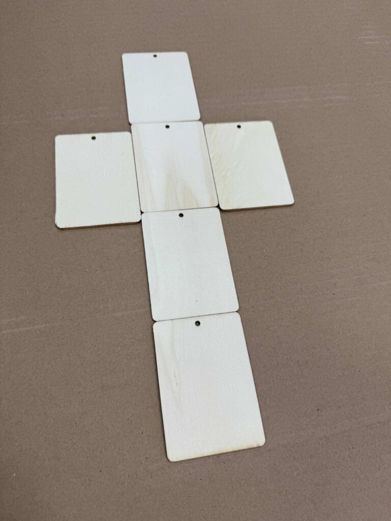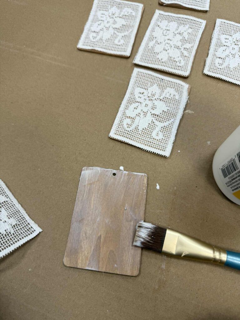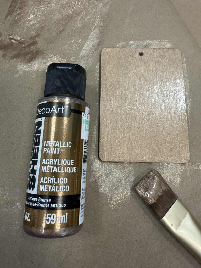 Once you have all of your lace squares cut out, it’s time to move on to painting the wooden rectangles. This is where you can really have fun and customize the look, because you can paint the rectangles any color you like. I decided to use a metallic antique bronze paint by DecoArt, which gives the pieces a beautiful aged look and adds a little extra depth and shine to the finished cross.