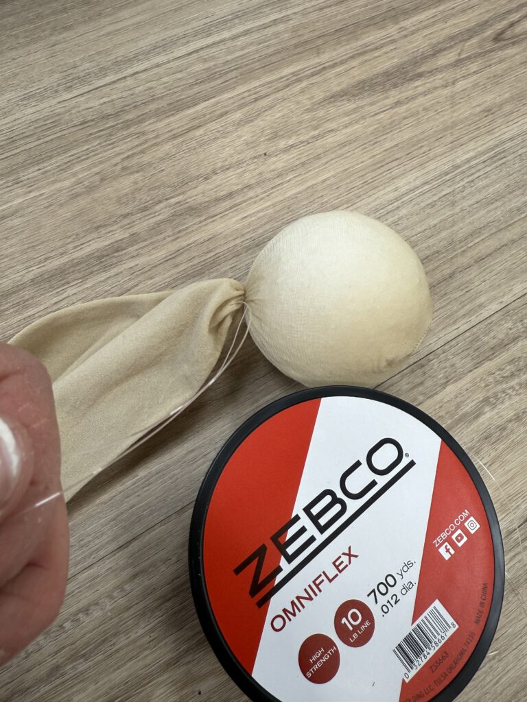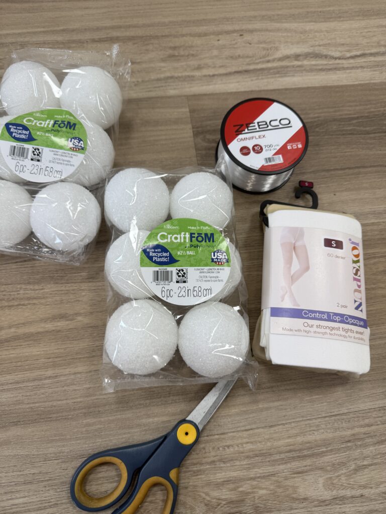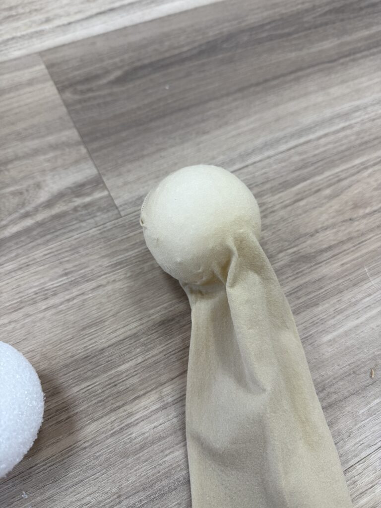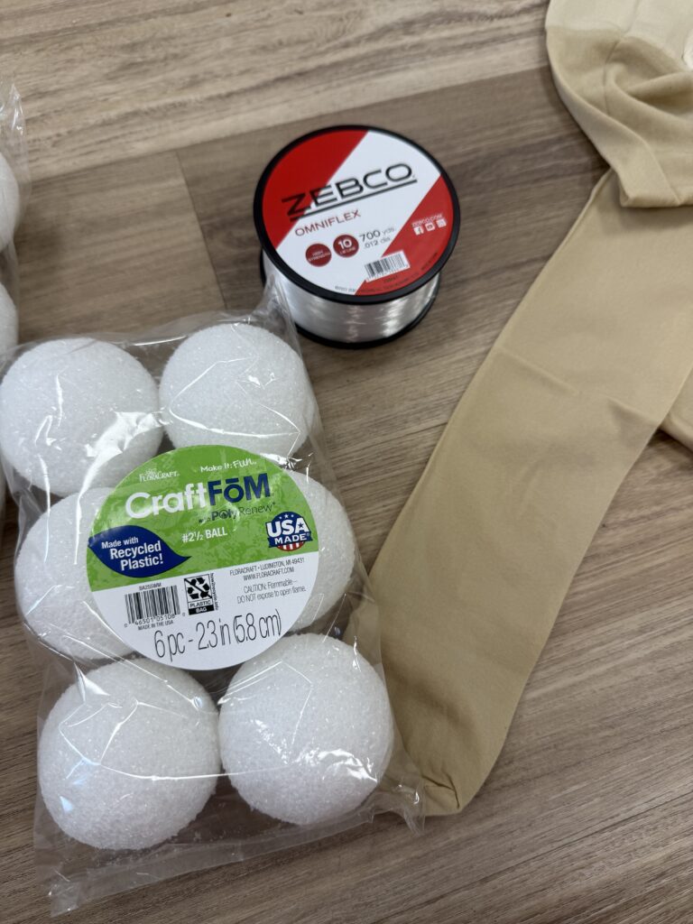 Then, I twisted the tights around and tied fishing line around the top of the styrofoam ball to secure it.