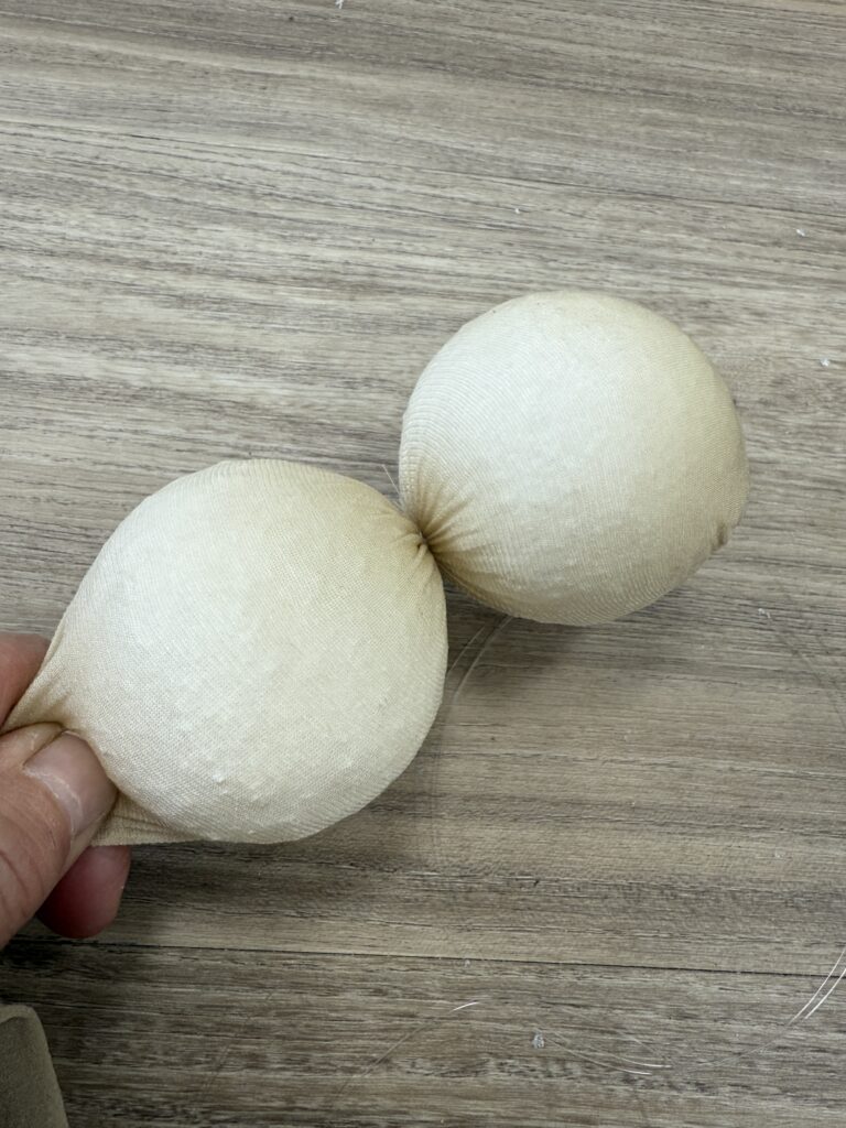 I started out by simply sliding one styrofoam ball down the leg of the tights. As soon as I did this, I knew it was exactly what I wanted!
