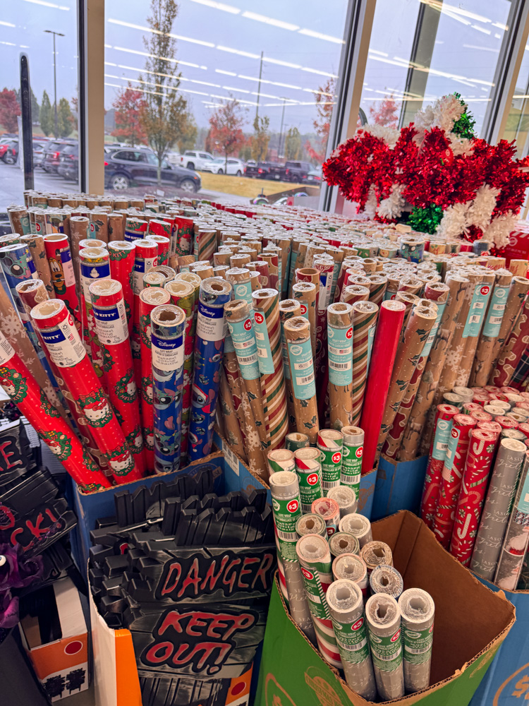 I always stock up on gift wrap early, and Dollar Tree has some of the cutest designs! From traditional Christmas patterns to Disney and Hello Kitty prints, there’s a roll for every gift under the tree — and it’s such a simple way to make presents look special on a budget.
