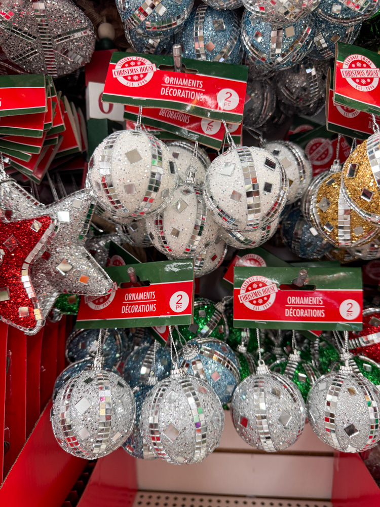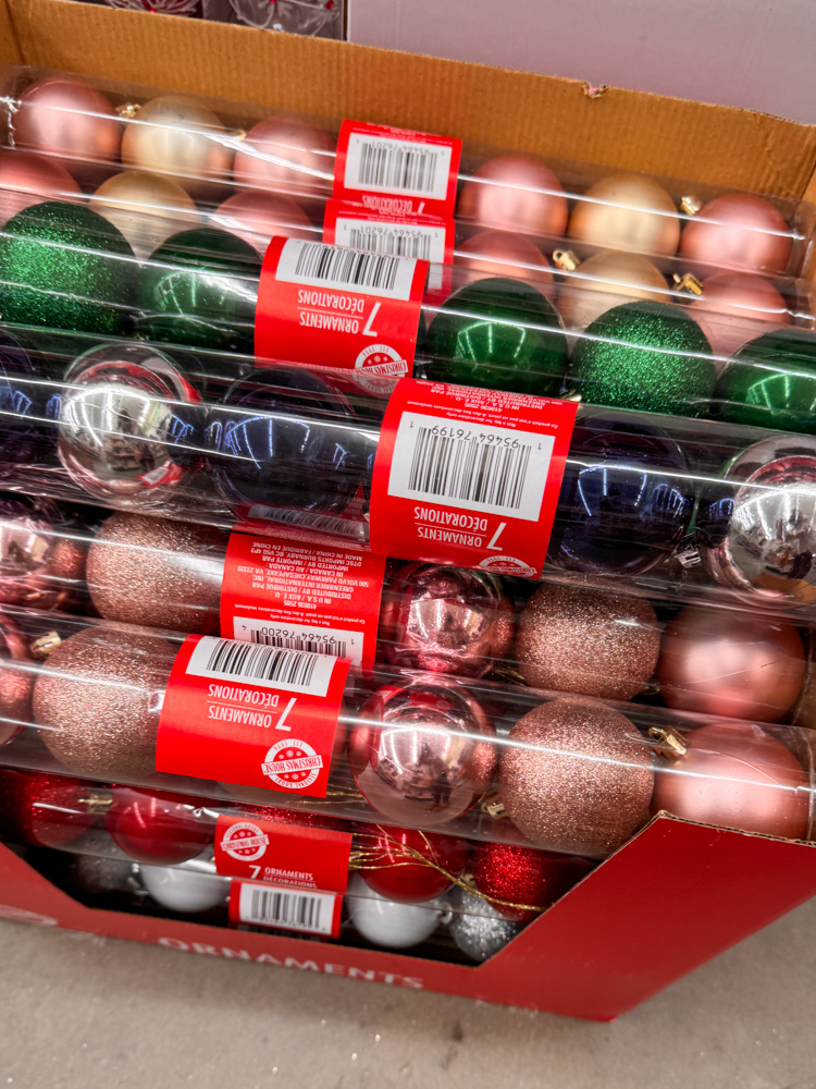 I love that Dollar Tree carries classic ornament sets like these. They come in so many colors — metallics, rose gold, red, green — and they make it easy to fill your Christmas tree without spending a fortune.