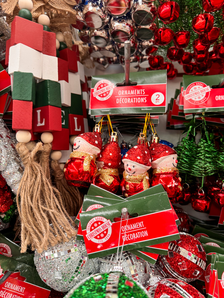 Just look at this festive wall of Dollar Tree ornaments! There’s everything from sparkly snowmen and penguins to rustic pinecones and plaid pieces — such a fun mix of Dollar Tree finds for Christmas that can fit any theme you’re decorating with this year.