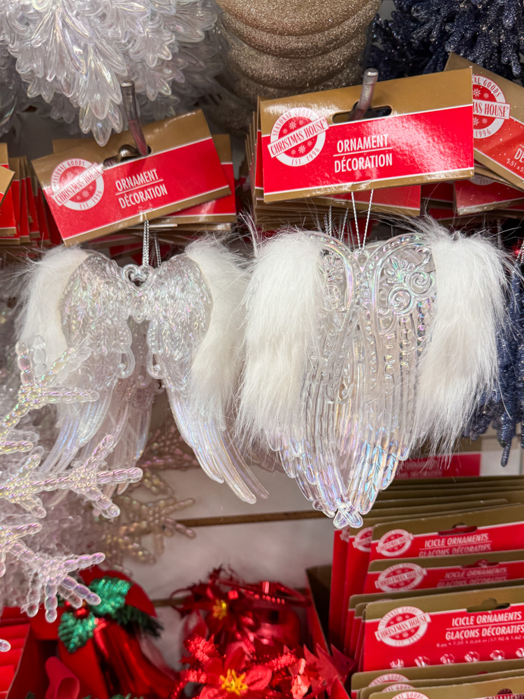 These iridescent angel wings are absolutely beautiful in person. They look high-end, but they’re one of those Dollar Tree ornaments that proves you can decorate elegantly without spending much at all.