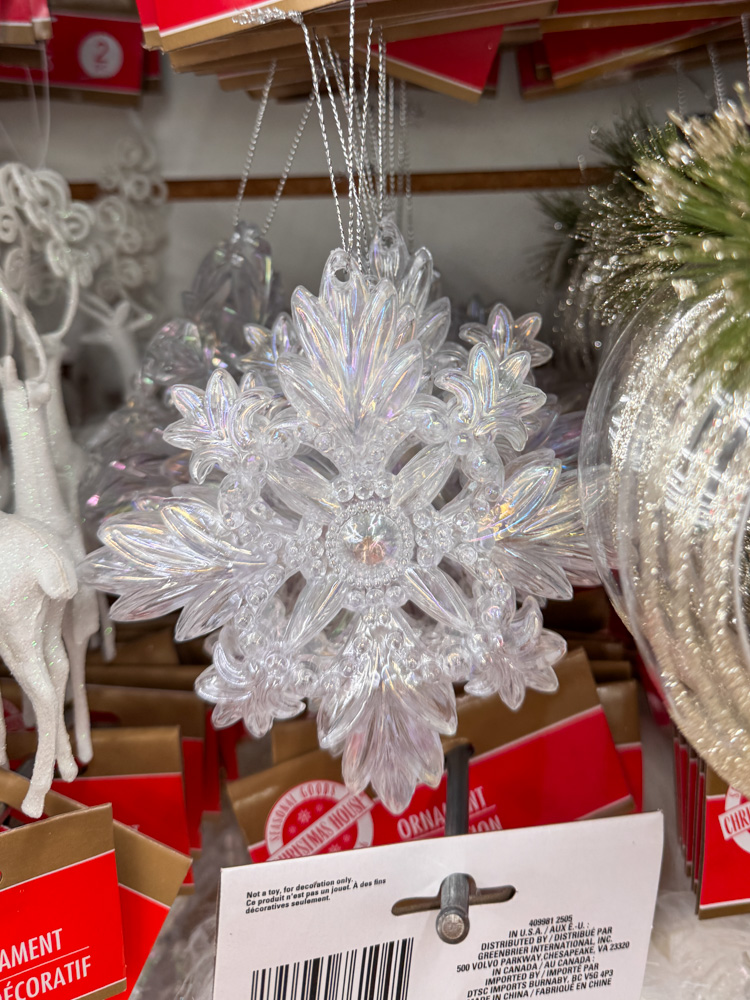 This clear snowflake is so pretty when it catches the light! It’s one of those simple Dollar Tree Christmas finds that can make your tree shimmer. I love mixing pieces like this with flocked branches or twinkle lights.