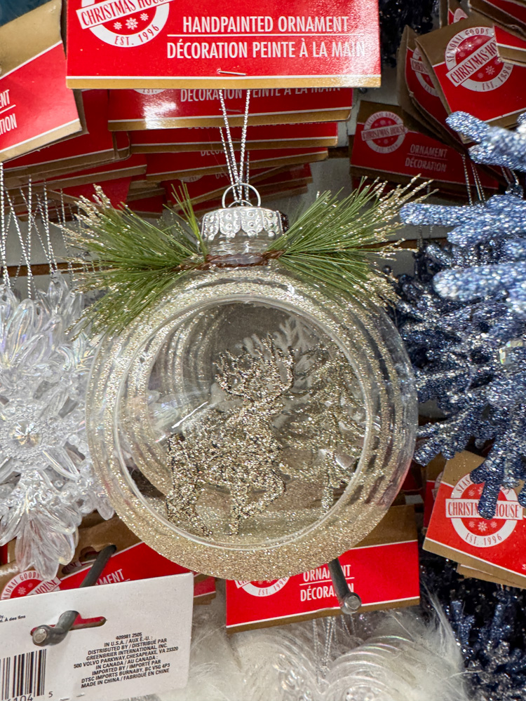 This might be one of my favorite Dollar Tree ornaments of the season! It has a classic Christmas look with the glittered reindeer, pine greenery, and a bit of sparkle — perfect for a neutral or woodland-style theme.
