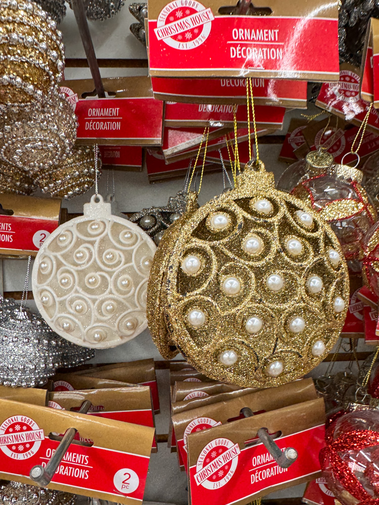 These gold and pearl Dollar Tree ornaments are such a classy find! They look so elegant on the tree and would blend beautifully with white lights and gold ribbon for a timeless Christmas look.