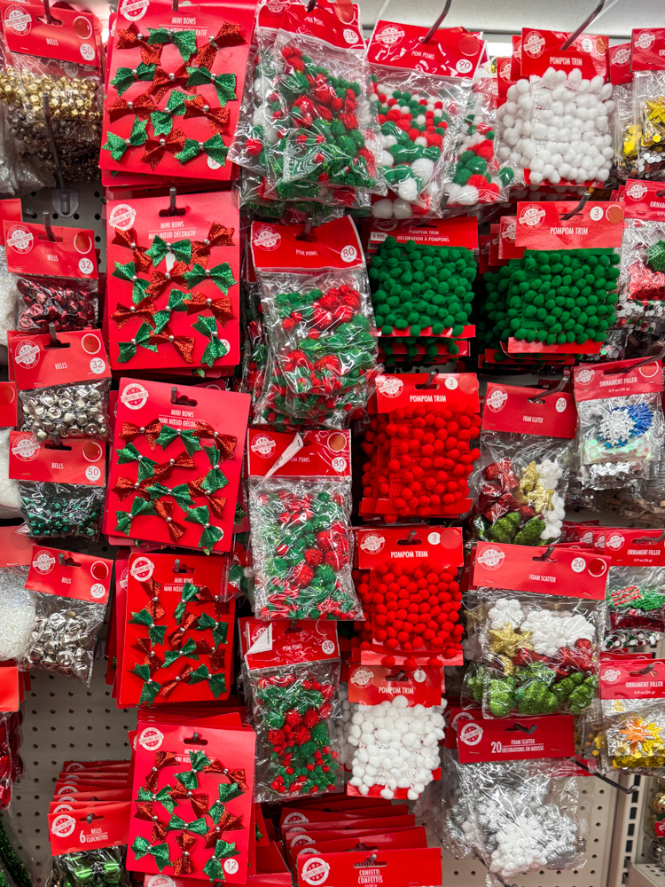 This section always gets my creative wheels turning! From mini bows to pom poms and glittery foam shapes, Dollar Tree finds for Christmas like these are perfect for adding little handmade touches to your crafts and gifts.