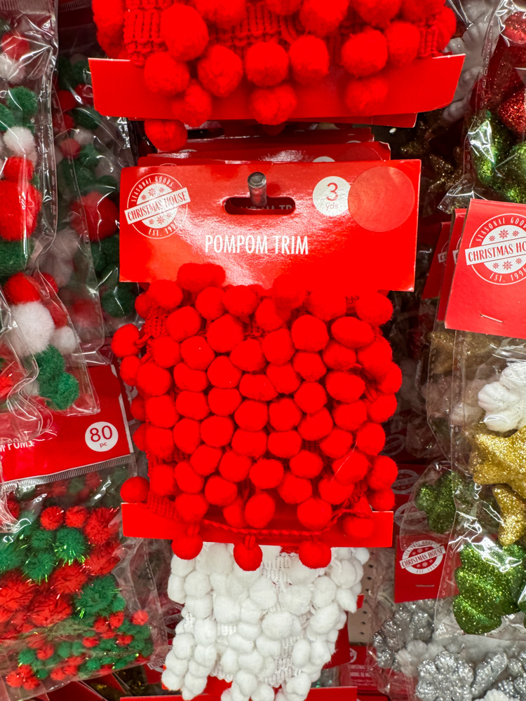 How fun is this Dollar Tree pom pom trim? You can use it to edge stockings, wrap around a mini tree, or even hot glue it onto ornaments for a playful pop of texture.