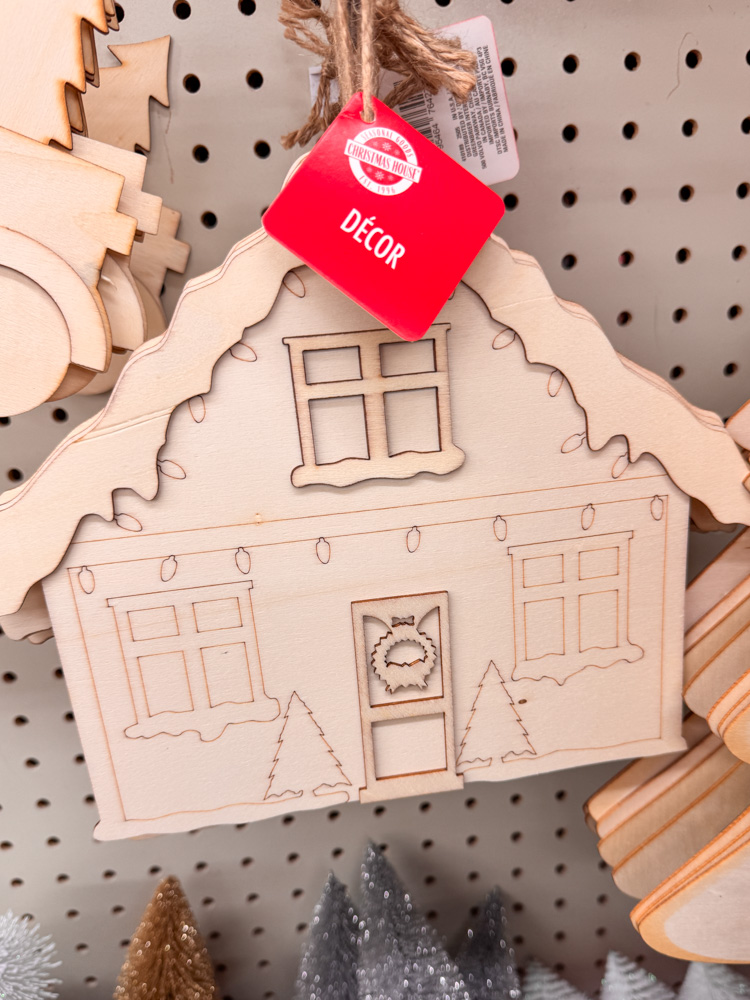 I love these unfinished wooden pieces from Dollar Tree! This little house shape is perfect for painting, stenciling, or turning into a personalized Christmas village piece.