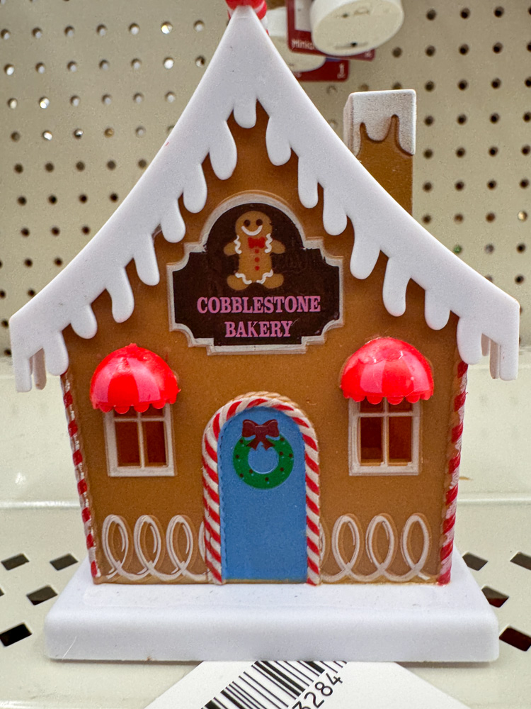 How sweet is this Cobblestone Bakery? These mini Dollar Tree Christmas houses remind me of a tiny gingerbread village — perfect for tucking onto a shelf or mixing into a snowy display.