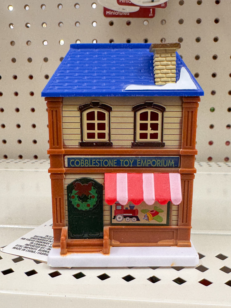 Here’s another piece from the Dollar Tree Christmas village collection! The Toy Emporium has such charming details — a red awning, a wreath on the door, and even a little toy train in the window.