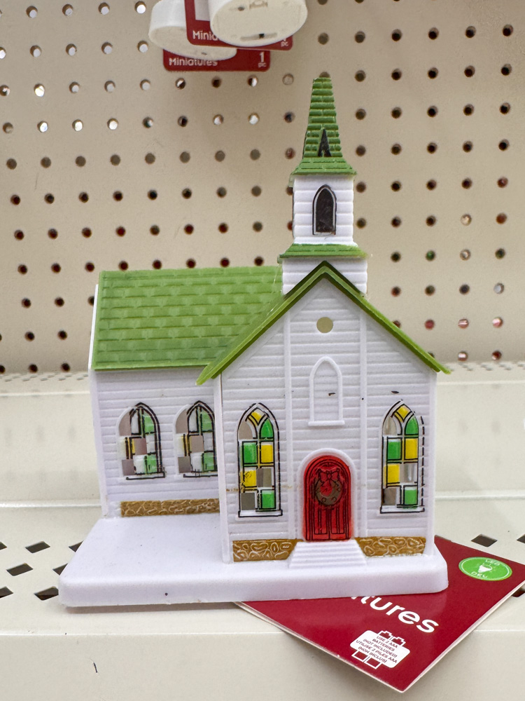 This white church might be my favorite Dollar Tree find for Christmas villages this year. The red door, green roof, and stained-glass windows give it such a classic holiday feel.