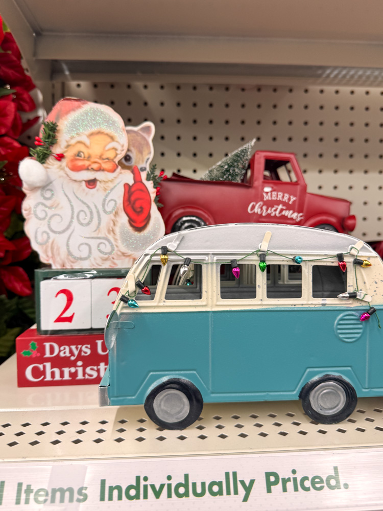 How cute is this little teal van covered in Christmas lights? Dollar Tree Christmas decor always brings out the nostalgia — especially with that vintage Santa and red truck in the background!