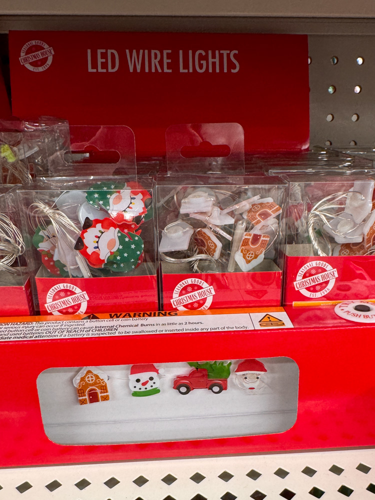 These little Dollar Tree LED wire lights come in so many fun designs — Santa, trucks, snowmen, and gingerbread houses! They’re perfect for wreaths, tiered trays, or even crafting projects.