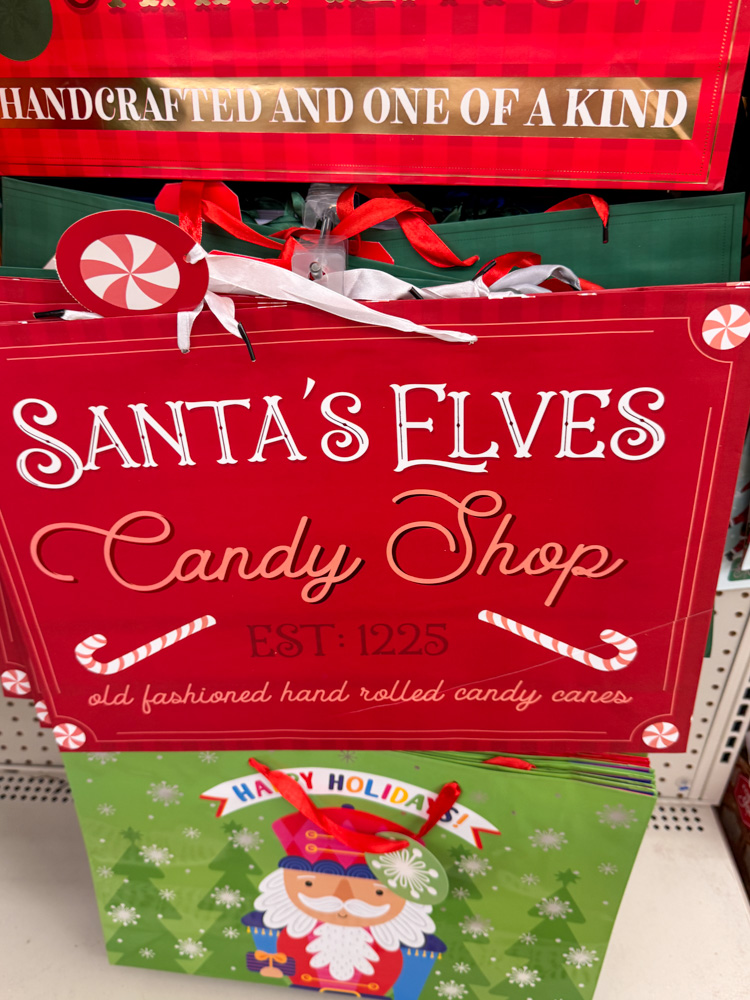 I always grab a few of these cute Dollar Tree Christmas gift bags! The designs get cuter every year — and they’re perfect for wrapping gifts when you’re short on time but still want that festive look.