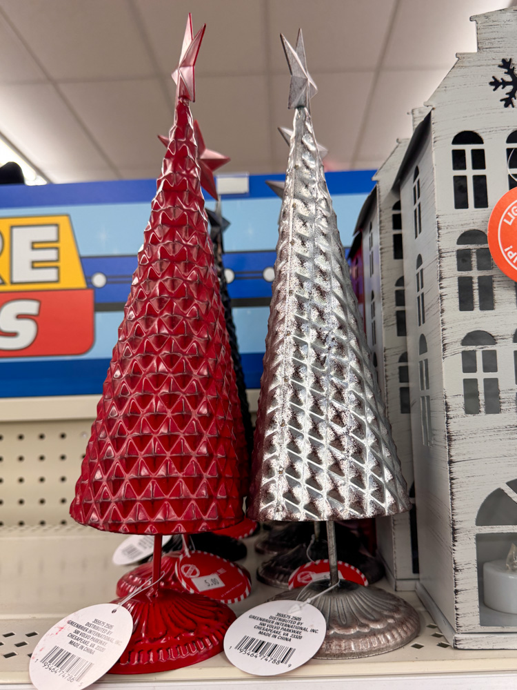 How fun are these metal trees? Dollar Tree has really stepped it up with their decor this year — these red, black, and silver trees have a modern look that would mix perfectly with farmhouse or vintage pieces.