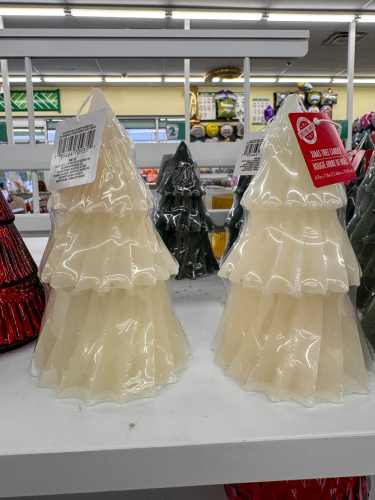 These Christmas tree-shaped candles are one of my favorite Dollar Tree finds for Christmas! They look beautiful on a mantel or shelf, and they come in a few colors so you can match your holiday theme.