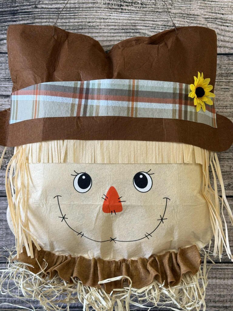 This DIY came together so quickly and easily, and I really hope you’ll give it a try! This cheerful scarecrow will look adorable on your front door or hanging anywhere in your home.